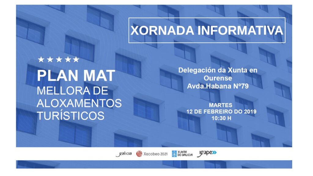 JORNADA DE PRESENTACIÓN DEL PROGRAMA REFORMA-TUR 19 Achégase convocatoria da reunión informativa que terá lugar o próximo martes 12 de febrero ás 10:30h. na Delegación da Xunta en Ourense. (Avda. Habana 79) sobre as axudas do Plan MAT da mellora de aloxamentos turísticos. (na actualidade atópanse en prazo de presentación de solicitude) […]