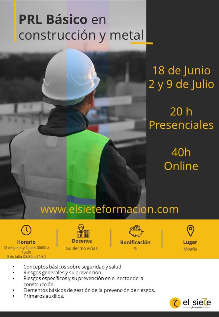 Informar de la convocatoria del CURSO de PRL Básico en construcción y metal, a través de El Siete Formación: Curso presencial en el centro de formación 20 h y Online 40h. HORARIO: sábado 18 de junio y 2 de julio (8:00 a 15:00 horas) y sábado 9 de julio (8:30 a 14:30 horas) LUGAR: Instalaciones EL […]