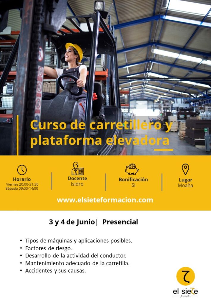 Informar de la convocatoria del CURSO DE CARRETILLERO Y PLATAFORMA ELEVADORA a través de El Siete Formación: Con este curso conocerás el funcionamiento, las normas de seguridad mínimas para la utilización y manejo de esta maquinaria a fin de limitar los riesgos de accidente, daños materiales y aumentar la seguridad de los trabajadores. Se divide en una pequeña parte […]